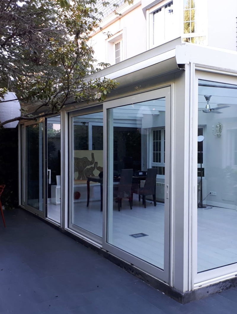 Cerramiento en porchada de aluminio en acabado blanco con techo de cristal fijo. Ahora nuestro cliente disfruta de este nuevo espacio los meses más frios.