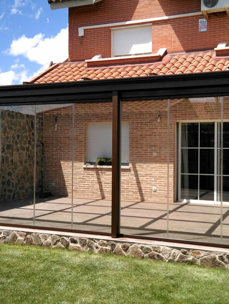 Aquí realizamos un cerraminto completo con cortinas de cristal sin perfiles con un aluminio acabado en color marrón.