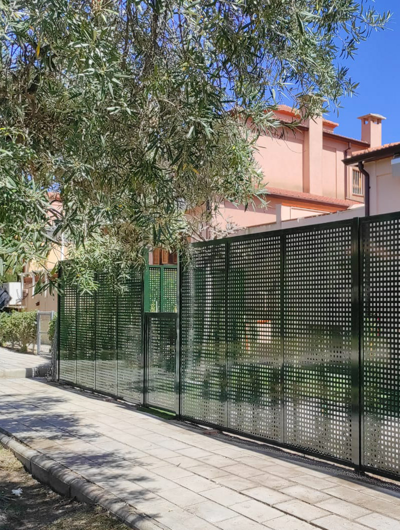 Una de nustras ultimas instalaciones. Vayado de aluminio en acabado verde oscuro con puerta de acceso. Ofrece gran privacidad y robustez..